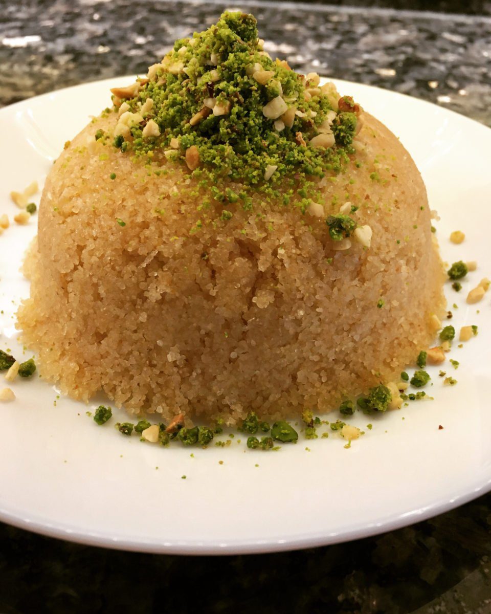 - Küçük bir kasenin içini streç film ile kaplayın. Hazırladığınız irmikten kaseye koyun, yanlarına doğru bastırarak ortasına bir çukur açın. Açtığınız çukura dondurmanızı koyun ve üzerini irmikle kapatın. Kaseyi servis tabağına ters çevirerek servis yapın. Üzerine fındık veya fıstık serpebilirsiniz.