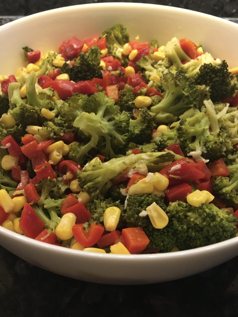 Közlenmiş Biberli Brokoli Salatası için; yıkanmış ve parçalara ayrılmış brokolileri haşlayın. Haşlanan brokolileri geniş bir kaba alın. Üzerine mısır tanelerini ve ufak ufak doğranmış közlenmiş kırmızı biberleri ekleyip karıştırın. Ayrı bir kapta, ezilmiş sarımsak, zeytinyağ, tuz ve limon suyunu karıştırın ve brokolilerin üzerine gezdirin.