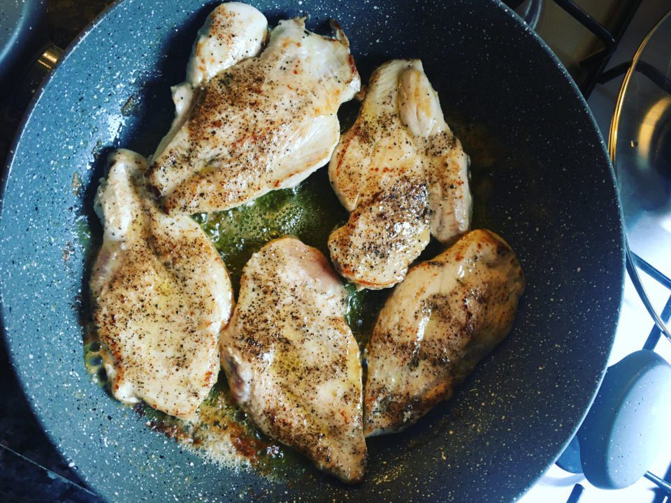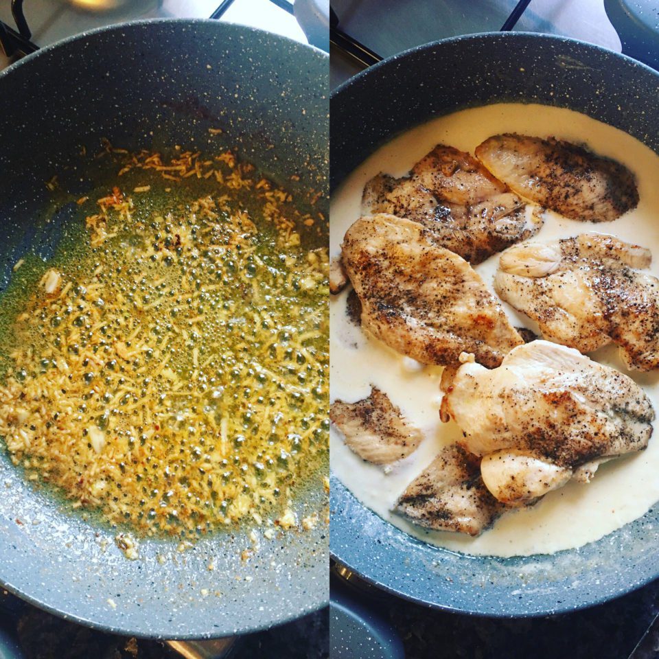 2. Tavaya tereyağını alıp eritin ve tavuk göğüslerini önlü arkalı kızartıp ayrı bir tabağa alın. Aynı tavaya rendelenmiş sarımsakları ekleyip kavurun, limon suyunu ekleyin karıştırın, kremayı da ekleyin karıştırmaya devam edin. Tuz ve karabiber de ekleyip krema göz göz olana kadar pişirin. Ardından rendelemiş parmeseniz peyniri de ekleyip karıştırın.
