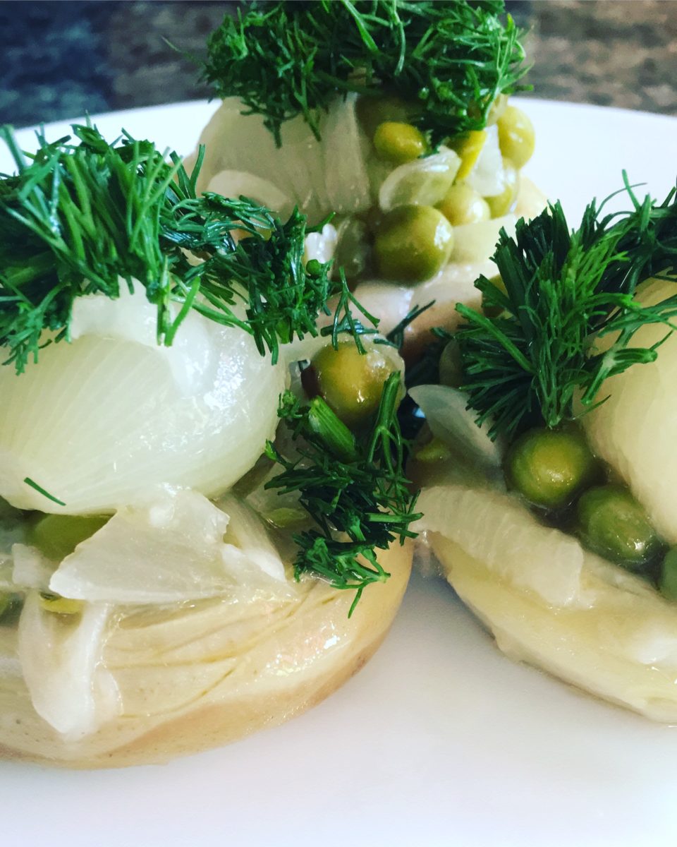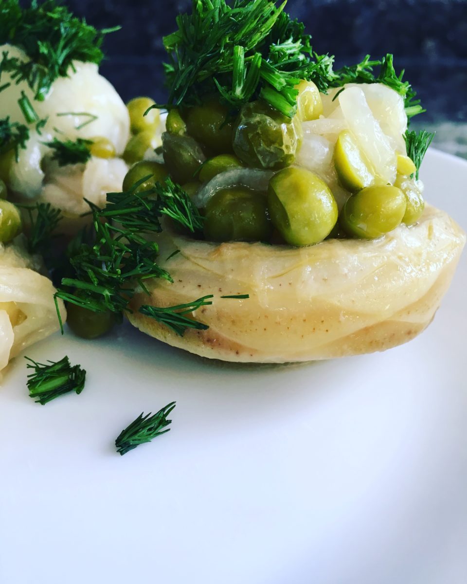 5. Yemeğiniz soğuyunca servis tabağına önce enginarları alın, üzerine soğan ve bezelyeli karışımdan koyun. Üzerini kıyılmış dereotu ile süsleyin.