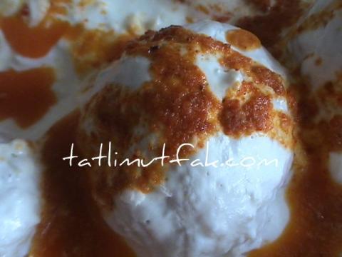 - Haşlamak için tencereye kaynamış suyu ve tuz\’u koyun ve birazcık kaynatın. Ardından köfteleri koyarak haşlayın. Haşladığınız köfteleri servis tabağına alın. Üzerine sarımsaklı yoğurt dökün. Dilerseniz sadece kırmızı biberle veya tereyağlı kırmızıbiberle servis yapın.