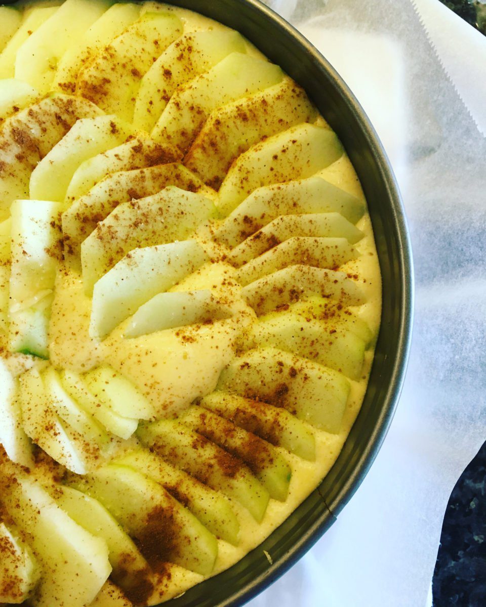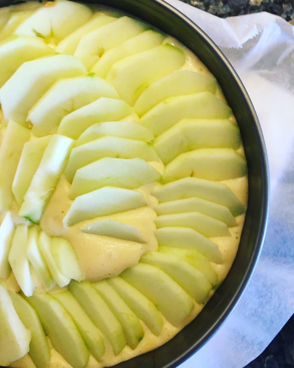 5. Yuvarlak kek kalıbının altına yağlı kağıt serin ya da yağlayın. Hazırladığınız kek harcını kalıba dökün. Üzerine ince olarak dilimlediğiniz elmaları dizin.